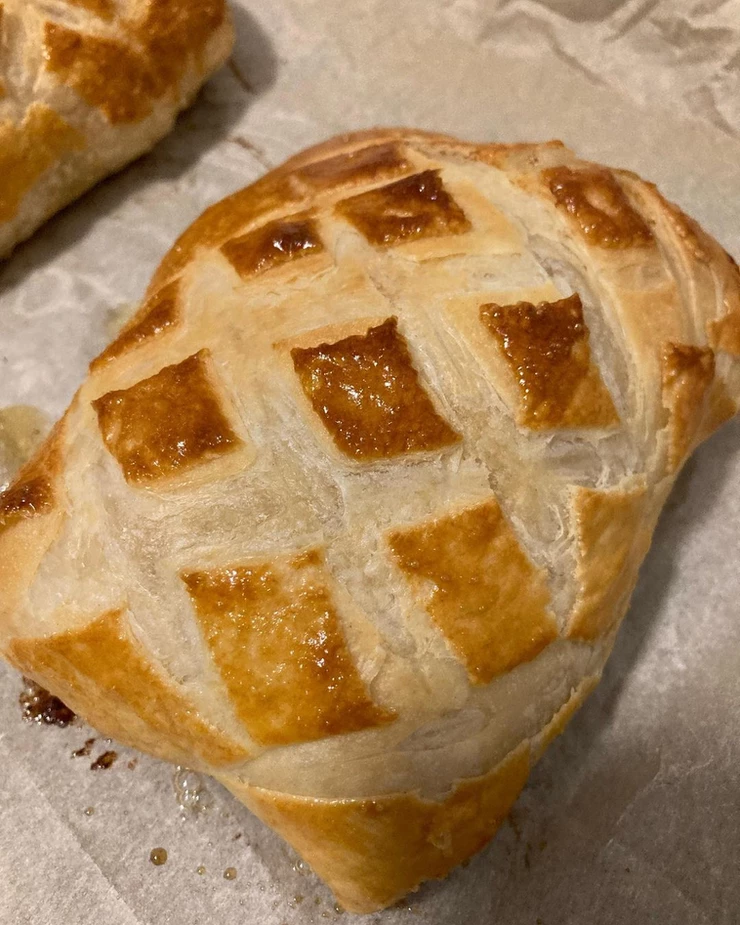 - Add a good layer of egg white on the surrounding pastry. This will help to glue the flaps of your pastry together and hopefully prevent the bottom from getting soggy. Fold the flaps one over the other so there is no more fish visible.