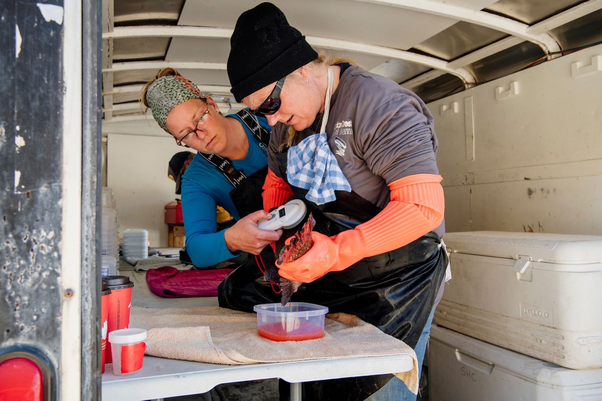 In the photo, you see us scanning the PIT tag on one of our breeders to identify who she is and track where her eggs go.