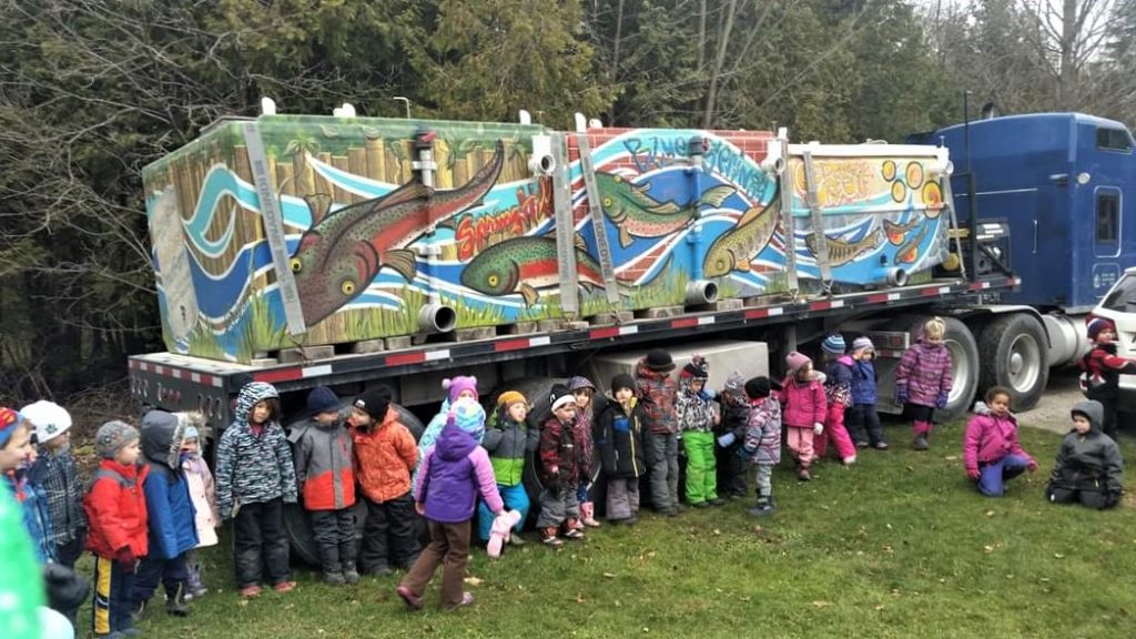 At our Cedar Crest farm, one mural across two garage doors tells a story of fish hatching and growing, and then heading to other farms on Manitoulin Island.