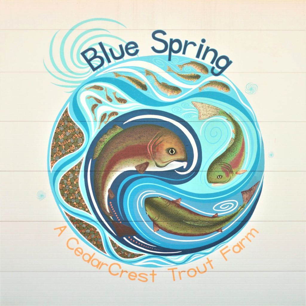 At our Blue Spring farm, another mural shows a fishy circle of life with a mama trout spawning in one of our natural blue springs!